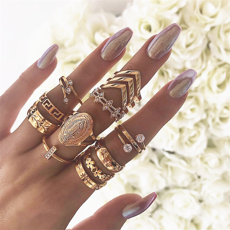 Boho Virgin Mary Cross Flower Leaves Gem Round Gold Joint Ring